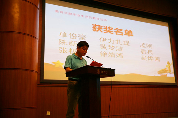 6月23日下午2点,教育学部2016届毕业生党员教育活动在逸夫楼报告厅拉开序幕。教育学部200多名毕业生党员胸佩党徽、统一着装,共同度过在师大的最后一次集体组织生活。教育学部党委书记汪海萍、党委副书记韩春红、学生事务部主任杨光富、关工委副主任钱景舫、特聘党建组织员沈霄凤、党建中心指导教师柳叶、陈媛,以及校友代表、上海师范大学谢晋影视艺术学院党总支副书记孙雅艳出席了本次活动。活动由教育学系2016届硕士毕业生党员卢正天、艺术教育部2014级本科生党员于点两位同学主持。