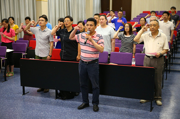 第三支部书记章菊萌做“两学一做”交流发言 最后,在雄壮的国际歌声中,全体共产党员面对党旗,在党远鸿书记的领誓下,饱含激情地重温了入党誓词。