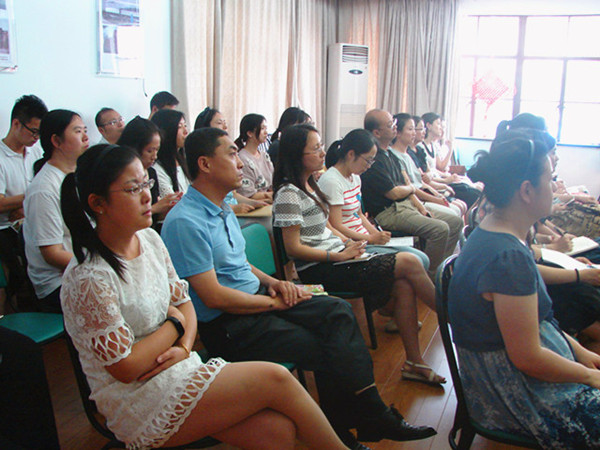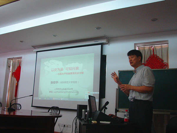 为进一步落实“两学一做”,加强对党员的教育,6月24日下午,对外汉语学院教工管理党支部与国际教育中心党支部“牵手”,特邀我校党校副校长张俊华为大家带来了主题为“以史为鉴,可知兴衰——中国共产党重要党代会分析”的精彩讲座。张俊华老师从鸦片战争前后的中国社会背景,到一大至七大,分析了中国共产党这一系列党代会的重要性。国际交流处党支部、对外汉语学院2014级研究生党支部党员也到场参加,活动由国际教育中心党支部书记胡玉曼主持。 讲座伊始,张俊华老师便以三个问题开场,与在场党员们进行了互动,顺利进入讲座的中心内容。同时,在每个阶段穿插了翔实的史料,真实的历史事件、丰满的人物形象、轻松幽默的语言让原本略显枯燥的党史变得生动起来。在讲座即将结束时,在场支部成员踊跃提问,而张俊华老师则通过具体例子切实地予以解答,直至讲座结束,支部成员们仍然意犹未尽。