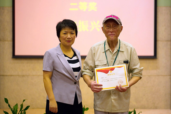 梅兵为获奖先进支部代表颁奖 随后,党员代表汤逸宗、鲍修德发言。汤逸宗在发言中回顾了十八大以来,以习近平同志为总书记的党中央严惩腐败、从严治党,不断加强党风廉政建设,不断解决党内存在的问题,赢得了人民群众的信任拥护,中国特色社会主义建设取得了伟大的成就,相信在党的坚强领导下我们的国家会更加富强;鲍修德通过回顾自己在党的领导和培养下,从一名青年学生成长为领导干部,以及退休后在学校和社区发挥余热的经历,表达了自己对党和人民的感激和热爱。两位同志的发言反映了我校广大离退休干部爱党、忧党、兴党、护党,为党的事业增添正能量的共同心声。