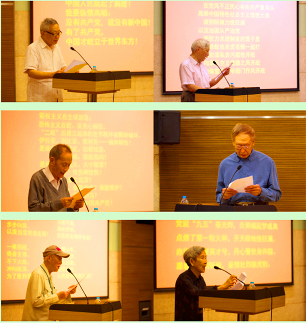 老同志倾情朗诵创作诗歌 大会最后举行了纪念建党95周年老同志诗歌朗诵会,离休干部王绍玺、王渭凊、刘铁坤、安振兴、汤逸宗、沈咏等六位老同志依次登台,慷慨激扬地朗诵自己为纪念建党95周年而精心创作的诗歌,讴歌中国共产党的光辉历史和伟大成就,倾述自己“不忘党恩,永远跟党走”的心声。
