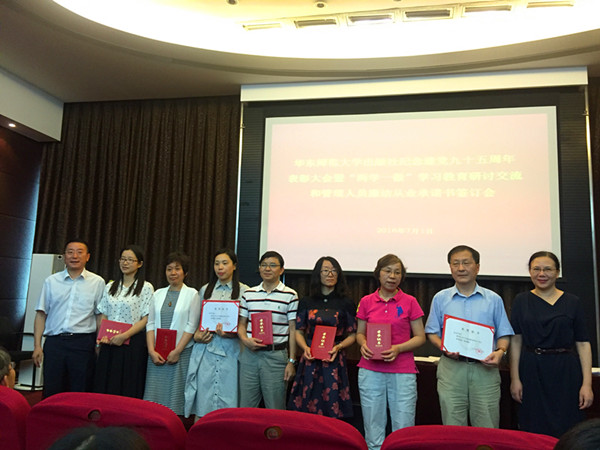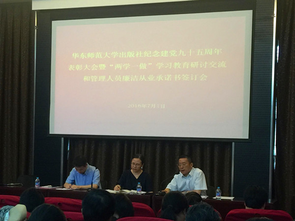 为纪念建党95周年,表彰出版社优秀共产党员,弘扬先进和树立标杆,推进“两学一做”学习教育,交流学习教育成效和体会,加强廉洁风险防控工作,签订管理人员廉洁从业承诺书,出版社党工委于2016年7月1日在智慧楼4楼报告厅隆重召开了华东师范大学出版社纪念建党九十五周年表彰大会暨“两学一做”学习教育研讨交流和管理人员廉洁从业承诺书签订会。出版社全体党员、中层副职及以上干部、工青妇负责人、重点部门和重点岗位有关人员等出席会议,出版社党工委书记夏祥伟主持会议。