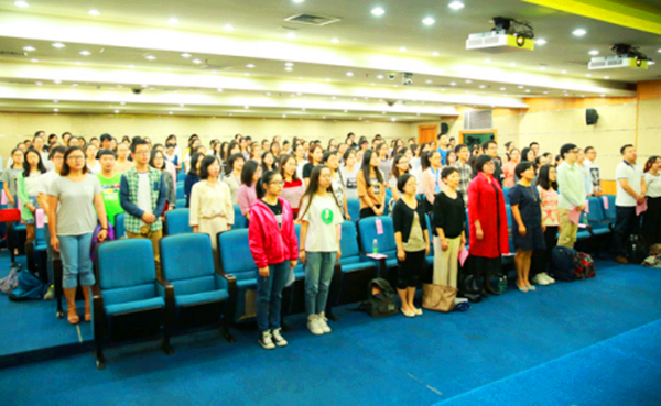 教育学部2016级新生党员教育活动举行 活动伊始,全场起立,奏唱国歌。随后,学生党建中心的柳叶老师先对学部近两年来的学生党建工作情况进行了详细深入的介绍,从党员管理、党员教育、特色的党员活动一直谈到“五个一”新生党员教育方案,勉励年轻的党员同志要珍视党员身份,重视党员活动,充分发挥党员的先锋模范作用。教育学部特聘党建组织员沈霄凤老师随后就新生党支部的建设工作提出要求:党支部的建设工作是认真而严肃的,欢迎富有激情、积极主动、自愿奉献的党员们加入进来,希望大家在继承党的优良传统的基础上,发扬开拓创新精神,共同建设有能力的、有信仰的新型党支部。