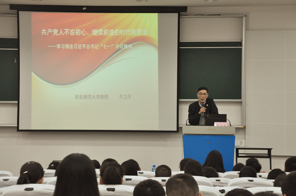政治学系党委副书记王子蕲主持开班仪式 之后,齐卫平老师为学员们作了党校的第一讲:共产党人不忘初心,继续前进的时代要求——学习领会习近平总书记“七一”讲话精神。齐老师通过许多生动的例子,从党的历史发展、现实需要和未来发展动力等方面细致地解读了“七一”讲话精神。他提到,中国共产党的历史是一部不忘初心,不断前进的历史;不忘初心才能保持共产党的政治本色,共产党人的初心就是以人民为中心和勇于担当;“不忘初心、继续前进”在国家发展中有非常重要的作用。