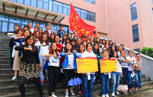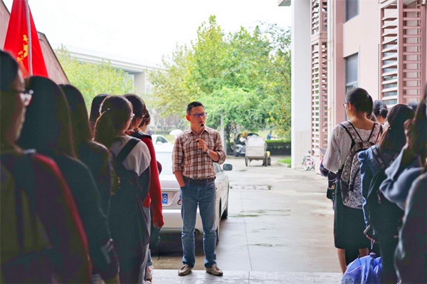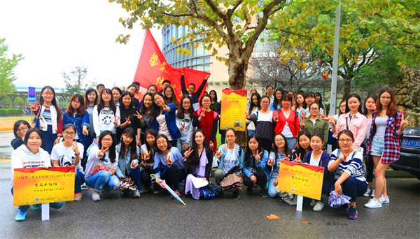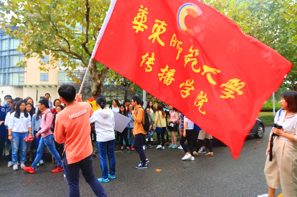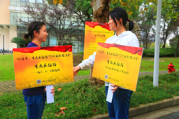 长征出发前合照 此次活动按照红一方面军和红二方面军的长征路线进行,沿途设置了长征途中的重要节点,用kt板向党员们和入党积极分子展示,如出发点瑞金、遵义会议会址、大渡河等,最终“会师”地点是会宁。所有参加者分为两支队伍,在传播学院(瑞金)前集合,分别沿着自己的路线出发,最终在行政楼(会宁)前汇合。