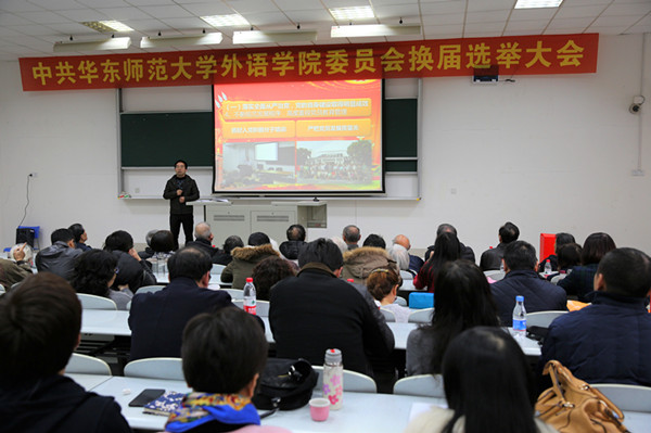 11月30日下午,中共华东师范大学外语学院委员会换届选举大会在闵行校区第一教学楼206教室召开,学院在职和退休教工党员及学生党员共计200余人参加了会议,会议由学院党委副书记兼副院长庄瑜主持。 会议以全场高唱《国歌》拉开序幕。会上,学院党委书记俞黎阳代表学院党委作题为《凝心聚力,开拓创新,努力推进一流外语学科建设》的工作报告。报告全面总结了2012年以来学院党委的主要工作,分析了在“双一流”建设背景下学院发展面临的机遇和挑战,明确提出了今后四年学院党委的工作重点。报告指出,过去四年来,在校党委的领导下,学院深入开展党的群众路线教育实践活动、“三严三实”专题教育、“两学一做”学习教育,以新一轮学科建设为契机,抓住机遇,谋划长远,深化改革,着力加强党的自身建设,注重优化队伍结构,努力提升人才培养质量,不断提高行政管理水平,大力推进学院文化建设,在推动学院各项事业全面发展中取得了丰硕的成果。