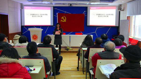 开放教育学院副院长程敏主持选举大会 教育学部党委副书记、开放教育学院党总支书记万明霞首先向全体党员作了2013—2016年学院党总支工作汇报,她从“加强思想政治建设,不断提高党员的政治素养和理论水平;夯实组织建设基础,不断提升学院团队凝聚力;发挥群团组织的桥梁和纽带作用,打造特色学院文化”三方面全面总结了学院组建以来的党建工作。