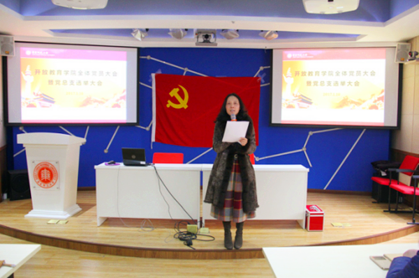 2017年1月10日下午,开放教育学院于中北校区网院楼105报告厅召开全体党员大会,选举学院党总支。教育学部党委书记汪海萍、教育学部党委副书记韩春红、开放教育学院领导班子、学院全体在职党员、退休四个支部共82名党员出席了本次大会。会议由开放教育学院副院长程敏主持。