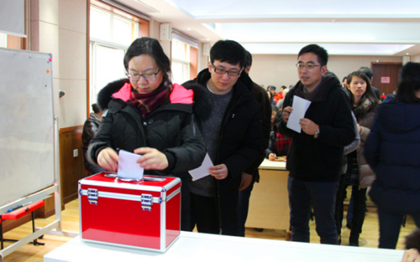 学院党总支书记万明霞作工作汇报 随后举行正式选举。程敏宣读了大会选举办法,并通过全体表决,推选了刘晓鸣同志为监票人,赵琦同志为计票人,吴昭同志为唱票人。在宣读党总支委员候选人名单及简介后,全体与会党员进行投票。经差额选举,最终选出开放教育学院新一届总支委员会委员:万明霞、闫寒冰、沈维宇、张俊、韦敏。
