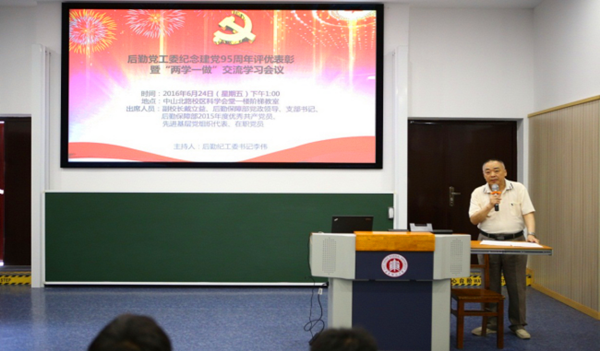 戴立益副校长为后勤先进基层党组织颁奖 后勤党工委要求党员积极争当后勤先锋,争做绝对忠诚、勤学善思、爱岗敬业、严谨负责、廉洁自律的表率,做合格党员。党支部在“两学一做”学习教育中负主体责任,党支部书记是第一责任人,要周密组织、抓实抓细,确保学习教育取得实实在在的效果,为后勤发展内涵发展提供有力支持。