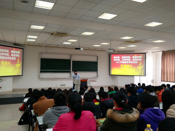 2017年3月1日,由数学系、哲学系、信息科学技术学院、物理与材料科学学院、化学与分子工程学院、体育与健康学院联合举办的2017年度学生党校在二教123室举行开班典礼。数学系党委副书记贾挚、信息科学技术学院党委副书记兼副院长崔海英、物理与材料科学学院党委副书记马红梅、化学与分子工程学院党委副书记龙文静、体育与健康学院副院长张昆,六个院系的党务指导老师以及239名入党积极分子参加了开班典礼,典礼由数学系党委副书记贾挚主持。2017年度联合学生党校在全体起立奏唱国歌中正式开始。
