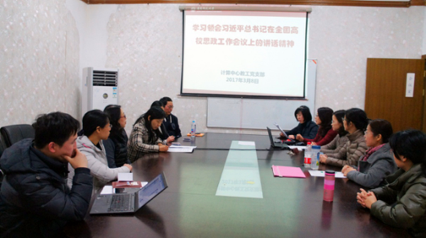 在全国人大第五次会议召开之际,计算机科学与软件工程学院计算中心教工党支部开展了2016-2017学年第二学期第一次党支部组织生活。 首先,全体党员根据学校和学院对本学期党员组织生活安排意见,针对本支部组织活动内容与形式进行了热烈讨论,力争使组织生活既务实又深刻。明确了本学期组织生活将深入学习习近平总书记在全国高校思政工作会议上的讲话精神;结合我校今年即将到来的教学评估活动,发挥党员的模范带头作用,帮助计算中心全体教师更好的完成教学评估任务;以纪念建党96周年为契机,学先进、促先锋、做表率。