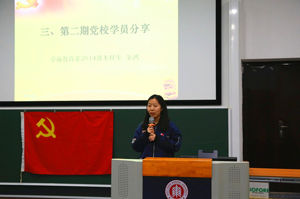 教育学部第三期学生党校开班 庄严的国歌奏响,开班仪式拉开序幕。通过一段视频短片,学员们一起回顾了学部第二期党校培训的精彩瞬间。上一期党校的优秀学员代表、学前教育系2014级本科生朱鸿,向新学员们分享了自己参加党校学习的感悟和体会,强调自我反思、自我学习的重要性,鼓励学员们明确目标、提升能力、不断进步,积极向党组织靠拢。