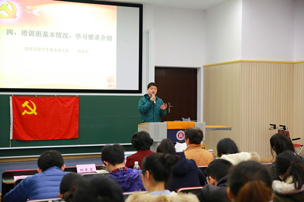 教育学部学生事务部主任杨光富介绍培训班基本情况 学部特聘党建组织员沈霄凤从马克思主义信仰与宗教信仰的区别出发,对“信仰”一词进行了明确的解读,强调了树立马克思主义信仰,从思想上入党,端正党校学习态度的必要性。 两位新学员代表也依次发言。本科生代表、特殊教育学系2015级本科生穆奕蓓同学表示,会珍惜这次进一步了解共产党的机会,端正入党动机,从小事做起,不断提升自己并影响身边的同学,更好地从思想和行动上向党组织靠拢。研究生代表、教师教育学院2015级硕士孙翔宇同学分享道,尽管自己入党的经历比较坎坷,但会在这一次次的磨练中不断充实和完善自己,积极向身边的优秀党员学习。