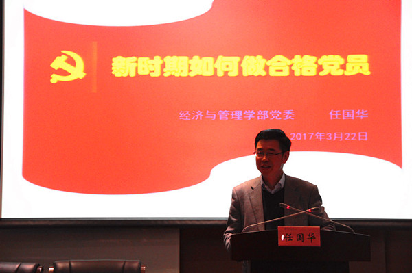 杜公卓作首场专题辅导报告 经济与管理学部党委书记任国华为学员们带来了以“新时期如何做合格党员”为主题的第二讲专题辅导。他首先通过对“新时期”、“合格党员”等概念的分析,引入《党章》中对党员权利和义务的表述,引导同学们思考党员标准的时代特征与实践要求。接着,通过对“两学一做”、“四讲四有”各项要求的具体分析,结合《普通高等学校学生党建工作标准》和全国高校思想政治工作会议精神,他从八个方面总结了“新时期新形势下高校学生如何做一名合格的共产党员”。他强调,党员合格不合格,在于平常的一言一行、一举一动,要学习党的理论、学习习总书记系列讲话,要坚持理想信念,正确对待社会主义事业在发展过程中存在的曲折和问题。之后,他向学员们介绍了荣获2015年“华东师范大学优秀共产党员”的两位经管学子的事迹,希望学员们在学习工作中起带头作用,关心集体,主动承担社会责任,提高为人民服务的本领。最后,他寄语同学们:“让我们共同努力,坚定党的理想和信念,以实际行动加入中国共产党,成为新时期合格的共产党员。”