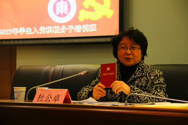 经管学部党委、经管书院党委2017年学生入党积极分子培训班开班 开班仪式上,经管书院党委副书记董盈盈介绍了本次培训班筹备过程与学员概况,并从“如何看待”和“如何对待”两个方面提出要求和期待。她表示,这次培训是发展党员的重要工作程序,是深化思想认识、增长知识、提升自我的重要学习平台,是书院开展朋辈教育的重要载体。她希望同学们能够牢记“严”、“实”二字,严肃对待,切忌走过场;拿出实干精神,认真参与,积极团队合作。 开班仪式结束后,华东师范大学关心下一代工作委员会常务副主任杜公卓以“端正入党动机,以实际行动争取早日加入中国共产党”为题作首场专题报告。杜老师首先展示了一段视频,让学员们从感情上认识第一代共产党人的精神面貌;接着,她结合生活实际以及时事政治,从“为什么要强调端正入党动机”和“怎样以实际行动加入中国共产党”两大主题展开分析,强调入党实际上是确定了党员的信仰和责任,强调入党动机的重要性在于保证党员质量,保证党的先进性和纯洁性,强调在大学生中发展党员的重要性在于大学生是实现两个一百年、建成社会主义强国的最主要的接班人,大学生是党员主要新鲜血液的来源。她指出,入党积极分子应强调学习,不断加强对党的认识和理解,坚定理想信念;应正确认识国内外大事;应不断提高个人综合素质。报告最后,杜老师勉励学员们要明确入党动机,尽早达到政治成熟,承担自己的责任,以实际行动来争取早日加入中国共产党。