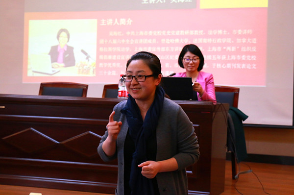 2017年3月29日下午,心理与认知科学学院党委于俊秀楼小剧场召开“两学一做”专题党课。本次专题党课邀请了中共上海市委党校党史党建教研部教授吴海红同志,为学院党员师生作关于党的十八届六中全会精神辅导报告。学院党委书记闫露老师主持了报告会。