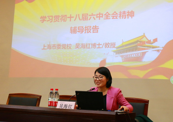 市委党校吴海红教授作关于党的十八届六中全会精神辅导报告 吴海红教授最后指出,目前全党的中心任务在于切实做好各方面工作,以优异成绩迎接党的十九大召开,为实现“两个一百年”奋斗目标、实现中华民族伟大复兴的中国梦作出更大贡献。这更加要求在座的各位党员、预备党员以及积极分子同志能够更好地贯彻落实中央精神,进一步提高自己,做一名合格的党员,发挥自己的党员的作用。 比起对文字的解读,吴海红教授风趣而精炼的讲解让与会人员更深刻地了解了六中全会主要精神。闫露老师最后对本次组织生活的辅导报告进行了总结,并提出了进一步学习十八届六中全会精神的要求。据悉,心理与认知科学学院党委通过优质党课推广、党委委员微课进支部、与社会单位进行支部共建等方式推进“两学一做”制度化、常态化,重创新、求实效,得到学院党员师生的认可和欢迎。
