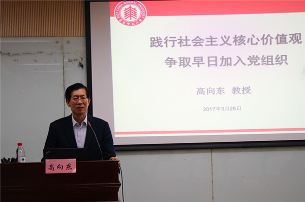 党校常务副校长徐继玲作“《党章》导读”专题辅导 经管书院党委书记高向东老师以“践行社会主义核心价值观,争取早日加入党组织”为题,为学员们带来专题辅导第四讲。高向东老师首先带领同学们重温了社会主义核心价值观国家、社会、个人三个层面的基本内容,随后加以解读。之后,高向东老师结合自己的专业研究,辩证地分析了不同时期不同社会制度背景下的核心价值观。他指出,自新中国成立以来,中国共产党始终坚持中国特色共同理想,继承弘扬培育民族精神与时代精神,并一直高度重视社会主义道德建设。在此基础上,他进一步分析了社会主义核心价值观的意义,在于这是我党发展中国特色社会主义制度、提升中华民族凝聚力和向心力、推进全面深化改革、构建社会主义和谐社会、提高国家文化软实力、实现中国梦的强大精神力量。最后,高向东老师结合个人层面,鼓励学员们爱国敬业。他表示,爱国是一种感恩的情怀,要理性爱国、奋力强国、精心治国,真正捍卫民族尊严;敬业是一种道德的境界,要培养专业感情,投身专业学习,担当社会重任,立业,勤业,爱业。