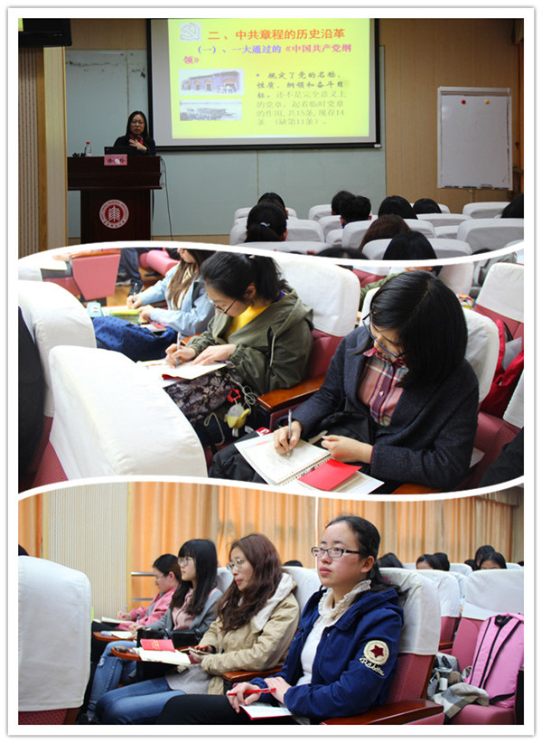 近日下午,经济与管理学部党委、经管书院党委2017年学生入党积极分子培训班第三、四讲专题辅导讲座在闵行校区统计楼109报告厅举行。华东师范大学党校常务副校长徐继玲老师,经管书院党委书记高向东老师作专题辅导,经管书院党委副书记董盈盈主持。 华东师范大学党校常务副校长徐继玲老师为学员们带来了“《党章》导读”专题报告,引领学员们深入理解《中国共产党章程》。徐继玲老师首先阐释了“党章”的概念、如何理解《党章》和学习《党章》的意义,指出党章是中国共产党理论的集中体现、是历史经验的科学总结、是党内的“根本大法”,也是每位党员必须遵守的党内最高准则。接着,徐继玲老师以党史上的“八部党章”、“六次修改”为脉络,介绍了《党章》的历史沿革,为学院们讲述了从一大至十八大以来每部《党章》的特点及其内容的变化,展开了相关的历史背景,引导同学们思考“一次的修订都是我党在曲折中不断前进的历史足迹”。报告最后,徐继玲老师带领学员们一起回顾了党的性质、指导思想、党员的基本义务以及入党誓词,并强调党校学员们要深刻理解《党章》,从现在做起,时刻以《党章》要求自己,争取早日成为光荣的共产党员。