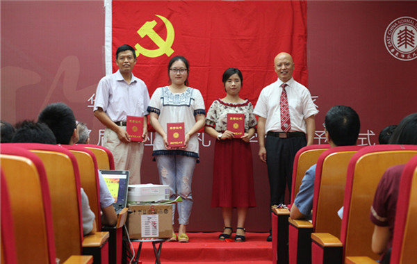 政治学系党委副书记王子蕲宣读表彰决定 大会首先隆重表彰了政治学系2016-2017年度优秀共产党员、优秀党务工作者和先进党支部,经各支部推荐、系党委研究,决定授予叶立煊等18名同志为“华东师范大学政治学系优秀共产党员”称号,授予何修猛等5名同志为“华东师范大学政治学系优秀党务工作者”称号,授予政治学系教工第一党支部等3个支部为“华东师范大学政治学系先进党支部”。赵正桥、王子蕲、何修猛等系党委委员分别为获奖的组织和个人颁奖。