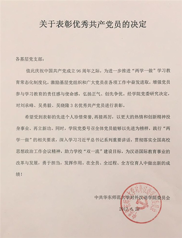 对外汉语学院党委开展纪念建党九十六周年表彰大会暨党员集体组织生活 |