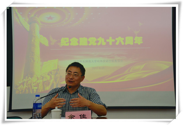 在建党九十六周年即将到来之际,对外汉语学院党委于6月28日下午举行了“纪念建党九十六周年表彰暨党员集体组织生活”。对外汉语学院和国际汉语教师研修基地全体在职党员教师及部分退休党员教师参加了活动。 在集中学习阶段,上海市第十一次党代会代表、华东师范大学学生工作党委书记、学生工作部部长余佳应邀做主题报告。余佳传达了上海市第十一次党代会精神,着重解读了中国共产党上海市第十届委员会题为《勇当排头兵 敢为先行者,不断把社会主义现代化国际大都市建设推向前进》的报告,就市委书记韩正参加自己所在的教卫、科技系统代表团审议时的情况做了介绍。他谈到,韩正书记与代表团成员围绕具有全球影响力的科创中心建设、世界一流大学和一流学科建设、加强高校思想政治工作等问题进行了热议。在谈及体会时,余佳认为上海在过去五年所取得的成就有目共睹,尤其是韩正书记的报告始终和党中央的方针、政策保持高度一致,描绘了上海未来五年发展的宏伟蓝图,鼓舞人心,催人奋起。相信上海会在新一届市委的领导下,取得更加丰硕的建设成果。余佳同时就全国及上海高校思想政治工作会议精神进行了解读,希望党员教师在实际教学、科研和管理工作中,坚持把立德树人作为中心环节,把思想政治工作贯穿教育教学全过程,实现全员、全过程、全方位育人。
