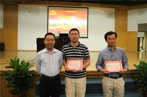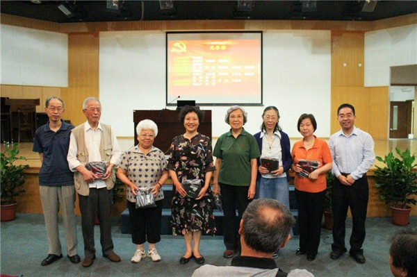大会表彰获奖人员 庄瑜通报了大学英语教学部党支部获校先进基层党组织、徐蓓丽获校优秀共产党员、陈曦获校优秀学生共产党员表彰情况。 大会还向入党逢五逢十周年的党员颁发了纪念品,与会党员同志一起过了一次集体政治生日。