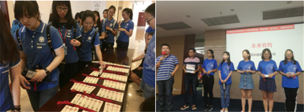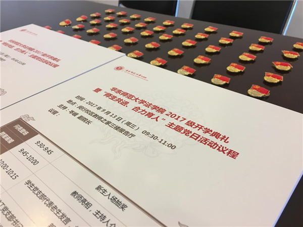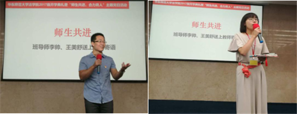 法学院加强顶层设计,创新方式方法,充分发挥教师党员带头表率作用,引导全体教师广泛参与,着力营造“师生共进、合力育人”的良好氛围。 师生牵手,结对共进。在开学前夕,法学院精心设计,用全体教师照片拼出了爱心笑脸,做成主页大图,欢迎新生;在迎新日,师生党员佩戴党员徽章,热情迎新;新生在法商北楼扶梯而上沿路抽取党徽型和心型卡片,翻开即是与自己结对的教师信息、联系方式。这是法学院为新生们准备的心之导航,由党员教师带头,全院教职工参与,教师们将在大学四年里主动为结对的学生传道授业解惑。迎新日适逢教师节,学院引导新生为结对教师发送祝福短信,送上节日的问候。教师为新生指引,新生为教师祝福,一场美丽的邂逅,师生共同体从此孕育成长。在开学典礼上,全体教师参与的开学典礼同时也是“师生共进、合力育人”主题党日活动。教师党员为新生深情寄语,典礼上更巧设抽奖环节。宪法学者、著名读书公号“雅理读书”版主田雷教授为幸运的新生们赠送精心挑选的著作,鼓励新生多读书、读好书。现场抽取的20名新生还收到一张装帧精美的“院长书记午茶会”邀请函,与院长书记相约金秋,共话未来与成长。