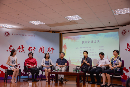 教育学部2017级新生党员主题教育活动现场 【树信仰:教师党员访谈】 庄严的国歌唱响,2017级新生党员们迎来组织“第一课”。汪海萍教授、顾小清教授、杨向东教授、杨福义副教授、董轩副教授、丁伟副教授,作为老中青党员教师代表与新生党员亲切见面并接受访谈。新生党员们通过采访的形式,聆听了教师党员们关于如何履行党员义务、保持党员先进性的经验与心得。