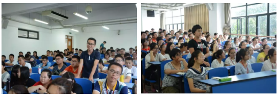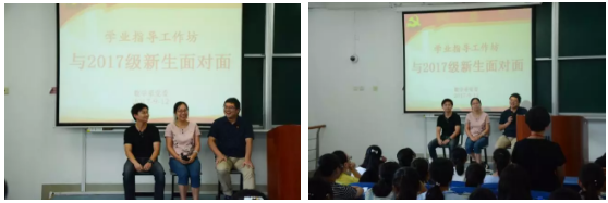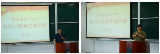 为全面深入贯彻落实全国高校思想政治工作会议精神和《中共教育部党组关于加强新形势下高校教师党支部建设的意见》精神,体现全程育人、全方位育人,9月12日下午,数学系党委组织了“学业指导工作坊与2017级新生面对面”主题活动,受到了学生们的热烈欢迎。 下午,数学系党员教师罗栗、王丽萍以及年轻教师朱萌早早地来到四教110。活动由数学系党委书记贾挚老师主持并介绍了学业指导工作坊相关情况。
