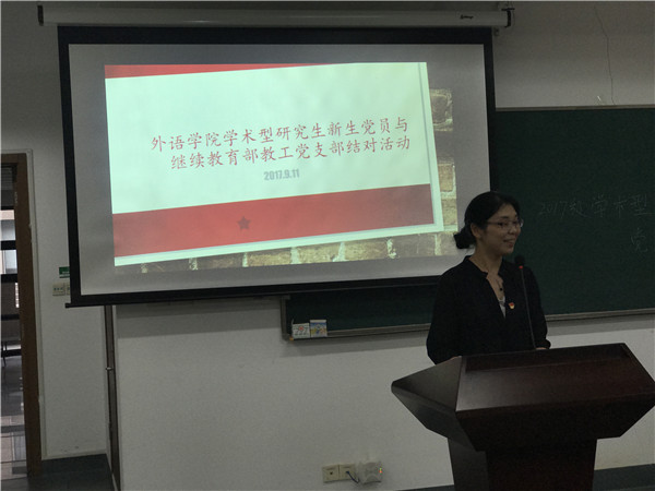 9月11日下午13:00,外语学院2017级学术型研究生党支部成立大会暨继续教育部教工党支部与研究生党支部结对仪式在闵行校区外语楼333教室顺利举行。继续教育部教工党支部书记张琳、研究生辅导员叶青、外语学院2017级学术型研究生党员参加了此次会议。张琳老师讲述了当前国际国内发展的形势,围绕“外语专业的学生可以有何作为?外语专业的学生应该有何作为?”两个问题和与会成员展开了讨论。与会同志热情踊跃,积极发言,最终大家在“语言优势利用好,推动优秀中国文化传出去”“切实扛起担当,讲好中国故事”等多个方面达成共识。