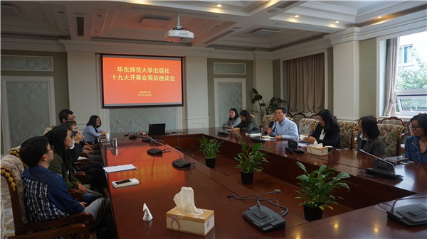 中国共产党第十九次全国代表大会于10月18日上午9时在北京人民大会堂隆重开幕。出版社党工委组织党员、入党积极分子等在中山北路校区出版社智慧楼2楼大会议室集体收看,认真聆听习近平同志代表第十八届中央委员会向大会作的报告。收看党的十九大开幕会后,与会人员进行了学习研讨和座谈交流。出版社党工委书记夏祥伟主持学习座谈会。
