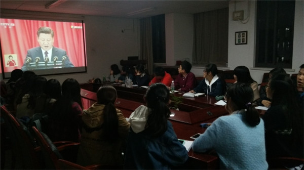 学生会成员观看十九大开幕会视频 副主席程丹阳说:“十九大上,习总书记阐述了我们社会主要矛盾的转化,由人民日益增长的物质文化需要同落后的社会生产之间的矛盾转化为人民日益增长的美好生活需要和不平衡不充分的发展之间的矛盾。这体现了国力和人民生活水平的提高,从穿的暖、吃得饱的需求上升到对美好生活的憧憬、对更优质生活的追求。前景可待,未来可期。作为一个中国人,我们应当在正确引导下,充分认识到当下问题,朝着更好的方向继续努力,建设社会主义。” 副主席许俊哲说:“距离党的十八大已经过去了五年的时间,五年前的我还觉得十八大,政府政策与我个人并没有什么关系,但是当我看到习主席说话的时候,我的整颗心都沸腾了起来。当习近平总书记说到‘中国特色社会主义进入了新时代。’我深刻地感觉到是这样的,中国从一个普通的发展中国家跻身世界强国之列,变成了中国制造可以与德国制造相媲美的一个时代。我深刻地感受到我的祖国在不断前进。之后又听到习主席说‘中国梦是我们这一代的,更是青年一代的。’我更加深刻地感受到了肩上的责任,未来中国的发展更需要依靠我们这些90后,00后来支撑,所以我们更应该努力发展自己,将来为祖国献出自己的一份力量。” 文艺部部长杨雨婷说,展望未来,我们有理由为祖国的日益强大和中华民族的伟大复兴保持信心。我们要时刻严于律己,坚持党的领导,紧跟党的步伐;要勇于承担自身责任,为社会主义发展贡献自己的力量;更要以身作则,带领青年学子为中华民族的伟大复兴而努力奋斗。 新媒体部部长孙琳说:“人心所向,决定存亡。人民的选择,就是历史的必然。江山就是人民,人民就是江山。全国人民代表大会的重要性不言而喻。而其中习近平主席的讲话更具有指导意义。习近平总书记心中时刻牵挂的,正是最广大的人民群众。无论是困难群众,还是普通百姓,都被放在优先战略地位。相信中国共产党紧紧依靠中国人民,实现向中华民族的伟大复兴迈进。” 体育部部长张佳怡说:“作为青年学生一代,习近平总书记的报告中充满了对我们的期待与激励:“青年兴则国家兴,青年强则国家强”,我们听到这样的激励更加充满斗志,为实现中华民族的伟大复兴奉献自己的力量。而对于我们这个专业而言,生态环境在习近平总书记的报告中也占了很大的比重,我们更应该加倍努力,并且脚踏实地,让已经被破坏的生态环境恢复起来,保护还未被过度利用的生态环境。” 通过收看十九大开幕式盛况,学生会成员更加关注十九大会议进程,对十九大报告精神有了更加深入的理解,并表示将更紧密团结在以习近平总书记为核心的党中央周围,谨记使命,开创未来。