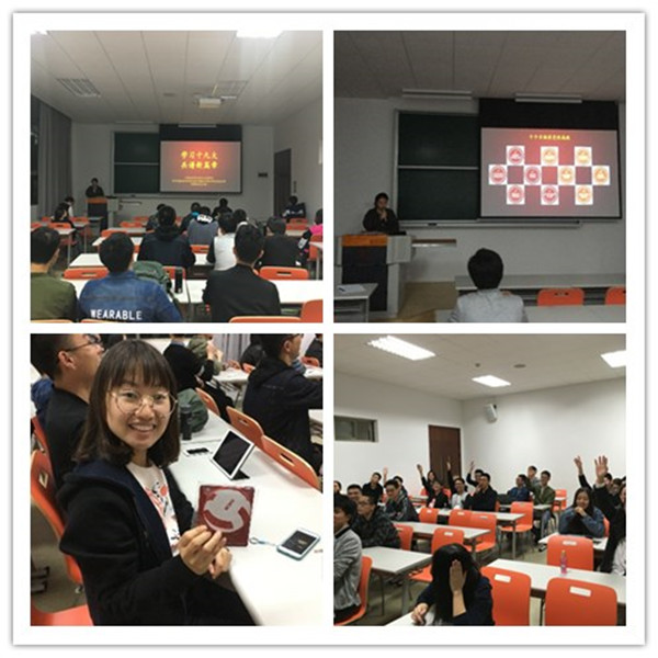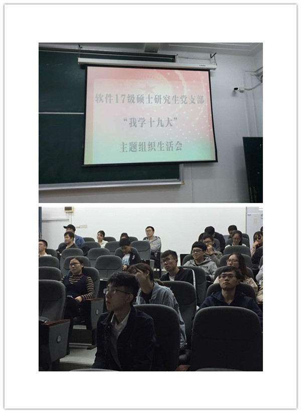 硕士研究生党支部举办“我学十九大”专题组织生活会 软件2016级硕士研究生党支部和软件2016级专业学位硕士研究生党支部联合举办了“学习十九大”的主题知识竞赛。活动伊始,主持人先就十九大会议主题、我国的主要历史成就、新时期党的方针政策等内容与在座党员进行梳理回顾;接着围绕学生党员普遍关注的诸如“就业政策、两岸关系”此类的热点问题进行了交流分享;最后大家一起学习了习总书记寄予青年的殷切期望,以此勉励自己要勇于创新、勇于挑战,永不停滞,永不懈怠。 之后,为了进一步加强与会党员对十九大会议精神的理解,党支部还将有关十九大精神的知识点凝练成题,开展了“学习十九大”的主题知识竞赛。在座党员纷纷举手抢答,真正做到了在游戏中学习,在欢笑中进步。