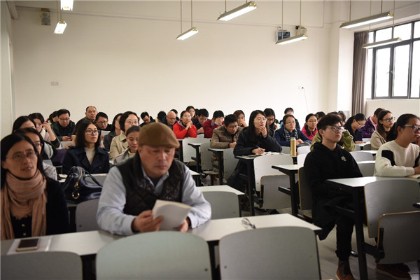 与会师生正认真聆听齐卫平教授报告 报告在师生们的掌声中圆满结束,齐老师的讲解为师生党员们清晰的呈现了十九大报告的重要内容,使与会的老师和学生们受益匪浅。本次生环学院教工党支部也是借每月例行的组织生活为契机,邀请齐卫平老师为全院师生呈现了一堂“干货”十足的党课,让学院师生党员在思想上得到了较大的提升。十九大胜利召开以来,学院党委通过各种形式组织全院师生党员开展对十九大会议重要精神的学习,先后为全院师生购买了《中国共产党章程》(2017年10月新修订版)、《决胜全面建成小康社会夺取新时代中国特色社会主义伟大胜利》等学习资料,本次邀请齐卫平教授到学院举办讲座,也是在全院师生自学的基础上,对报告内容进行再一次梳理和强化学习,参会的老师和同学们纷纷表示,对十九大会议精神又有了更为深刻的理解,同时作为生环人,一定会深入贯彻十九大报告中对生态文明建设的重要指示,为创建美丽中国贡献出自己的力量。