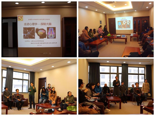 为深入贯彻落实党的十九大报告中关于“加强社会心理服务体系建设”、“加快一流大学和一流学科建设”的精神,让更多的人走进心理学,认知心理学。心理与认知科学学院的基础行政认知联合党支部、应用心理学党支部和发展与教育心理学党支部三个教工党支部于2017年11月29日下午共同组织开展了“走进心理学”系列活动中的首次主题党日活动:“探秘大脑”。 学院党委委员李先春副教授为师生党员作了关于“大脑”的专题讲座,介绍了大脑的组成结构和各自参与的高级认知功能,讲解了大脑的工作原理,分析了一系列脑疾病的成因。期间,详细介绍了中国脑计划,展望了人工智能的未来。在座的老师和学生针对讲座主题展开了深入的交流,尤其对人工智能和脑机接口展开了热烈的讨论。在活动过程中,师生党员们还亲自动手组装大脑模型,更加深入地了解了大脑的结构组成。
