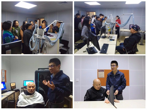 李先春副教授为师生党员作讲座 讲座结束后,李先春老师带领党员同志们参观了心理学院一楼的生理心理公共实验平台,为师生党员们演示了脑电图、近红外光谱成像仪等实验,师生党员们还体验了橡胶手幻觉实验,并亲自感受了脑科学研究过程。