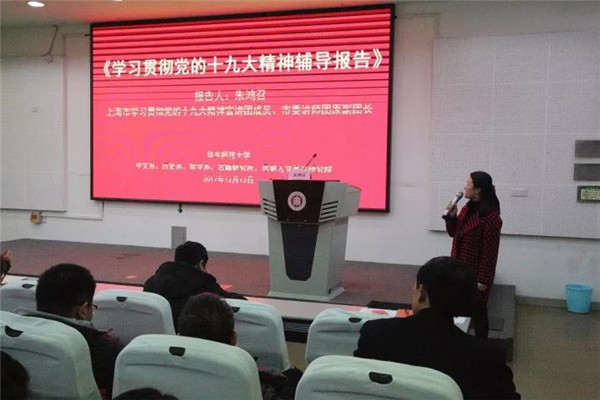 上海市学习贯彻党的十九大精神宣讲团成员、市委讲师团原副团长朱鸿召作专题报告 紧接着,朱鸿召老师为我们重点阐述了党的十九大主题和主要成果。朱老师紧紧围绕“不忘初心、牢记使命”的报告主题,引经据典,为我们梳理了中国共产党人从建党以来的初心与使命,回顾了党史的发展历程,特别指出我们党刚刚成立之时,中共一大代表们的初心底线不是为了穿衣吃饭,而是在中华民族处于内忧外患之时,一批知识分子、有志青年担当着为时代社会思考出路的伟大历史使命,共产党人从一开始的初心便是“为人民谋幸福,为民族谋复兴”,这是每一代共产党人坚持的初心,也是每一代共产党人所传承的历史使命。朱鸿召老师告诫我们要时刻牢记入党誓词,坚定自身的党性修养,将入党时的初心坚持到底,一定要拥有明确的底线思维,坚持中华几千年来的民族气节。 随后,朱老师为我们详细讲解了习近平新时代中国特色社会主义思想,从“八个明确”讲到“十四个坚持”,有理有据,联系社会实际生活,突出了这一思想的重大历史贡献。朱老师分析了中国过去五年发生的历史性成就和历史性变革,指出我们的社情、国情和党情已经发生了重大变化,中国特色社会主义将进入新的时代,我们要始终继续坚持“四个自信”,坚持走改革开放的正道,培育出中国智慧与中国方案,肩负起新时代中国共产党的历史使命,实现“四个伟大”——伟大梦想、伟大斗争、伟大工程和伟大事业。