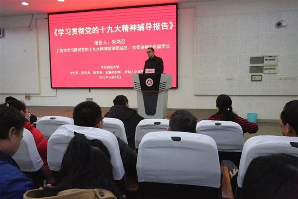 2017年12月13日下午2点,华东师范大学哲学系、中文系、历史系、古籍研究所、思勉人文高等研究所共同组织的《学习贯彻党的十九大精神辅导报告》讲座活动在华东师范大学第一教学楼110报告厅举行。上海市学习贯彻党的十九大精神宣讲团成员、市委讲师团原副团长、华东师范大学校友朱鸿召老师应邀给五系师生党员解读十九大报告。报告由哲学系党委书记杨海燕老师主持。
