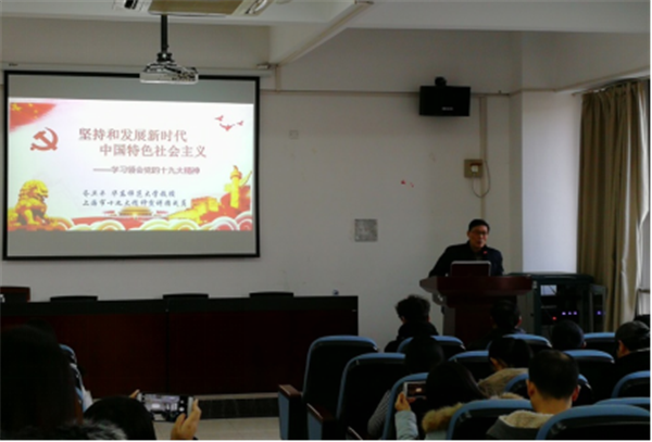2018年1月10 日上午,上海市十九大精神宣讲团成员、学校终身教授齐卫平为地理科学学院党员师生作题为“坚持和发展新时代中国特色社会主义——学习领会党的十九大精神”专题报告。地理科学学院党委书记段玉山、院长刘敏、副书记王婷婷、副院长余柏蒗、教工党支部书记乐群、本科生党支部书记王纯以及党员师生共120余人参加此次报告会。