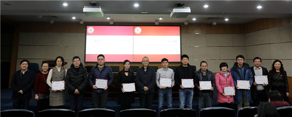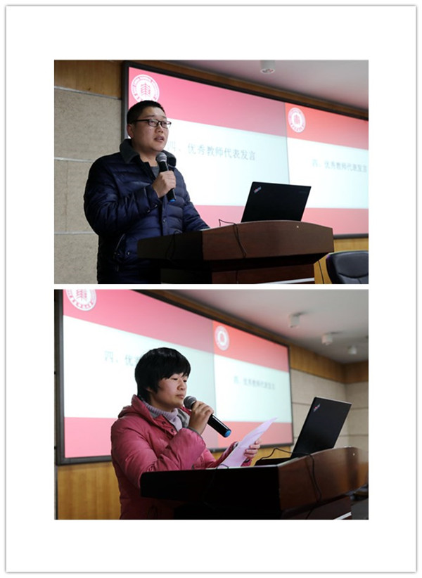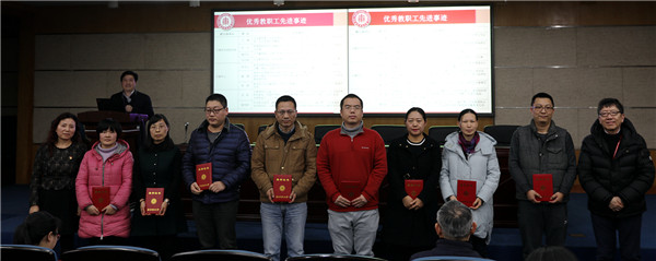 受表彰教职工上台领奖 随后,学院对2017年学科标杆性成果奖进行表彰,包括省部级以上科研奖、转化的发明专利、指导学生获奖、培养毕业留学生、出版教材、发表高水平论文等多个类别共计33人 63项,院党政班子领导为获奖教师颁发了荣誉证书。对2017年度学院优秀教职工的表彰,受表彰的20名教师在各自岗位上均做出了突出的成绩。孙仕亮和王高丽两位优秀教师代表还上台分享了过去一年的工作感想与心得体会。