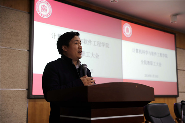 1月10日,计算机科学与软件工程学院在理科大楼A504举行全院教职工大会,隆重表彰先进。院长何积丰院士,党委书记李恺、副书记兼副院长洪燕、副院长姜宁康、王晓玲、蒲戈光及全体教职工共200余人出席大会,大会由学院常务副院长王长波主持。 常务副院长王长波首先对学院过去一年的工作做了简单的回顾,在全院师生的共同努力下,2017年学院整体建设取得了丰硕的成果,刚刚公布的教育部第四轮学科评估,软件工程学科获评A档,计算机科学与技术学科获评B+;学院连续第三年获得学校实体院系考评优秀;国家可信嵌入式软件工程研究中心通过验收;上海市可信物联网协同创新中心考评优秀并或延续支持;上海市高可信计算重点实验室考评优秀。为了更好激发教职工的教学科研的热情,全力以赴投入学院新一轮学科发展,特此对2017年在各自岗位上做出突出贡献以及取得优秀成果的老师予以表彰。
