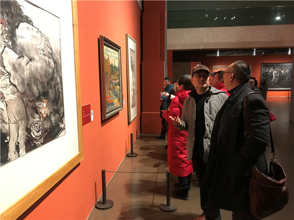 党员们观看展品 随后,师生党员们赴中华艺术宫参观“从石库门到天安门”上海美术作品展。此次作品展展出的96件作品,象征中国共产党96年的光辉历程。这场具有史诗气质的画展通过“门”这一极具象征性的符号,回顾中华民族波澜壮阔的历程并展望未来,每一幅作品都在诉说着一个故事,每个参观者都从中汲取了力量,受到了鼓舞。不少学生党员看到在书本上的画作展现在眼前激动万分。
