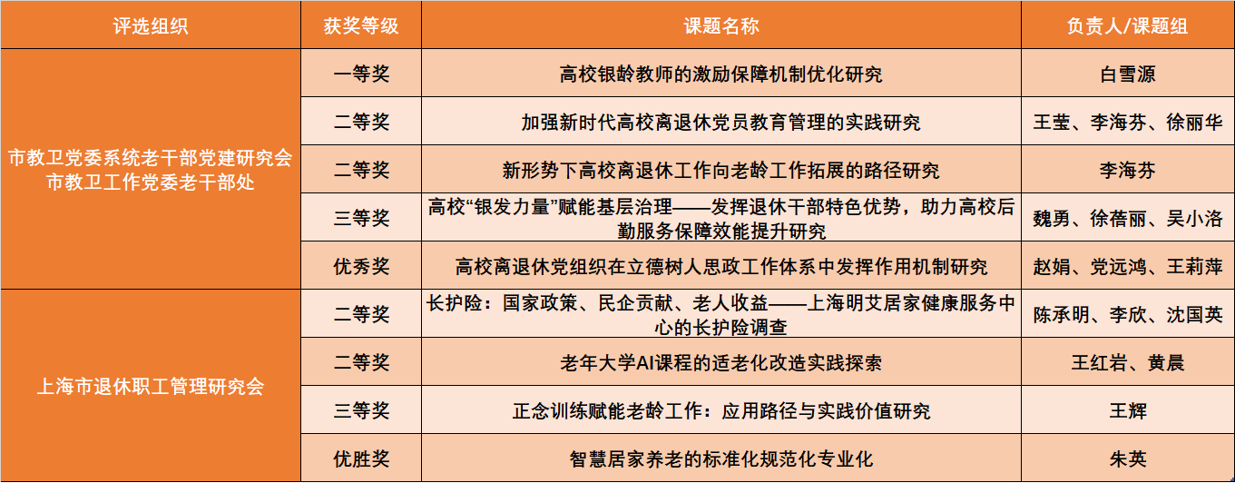 近日,2025年度上海市教卫系统老干部工作优秀调研成果及上海市退休职工管理研究会优秀论文评选结果相继揭晓,华东师范大学的老龄工作实践探索在两类评选中取得丰硕成果,多篇调研课题获奖。