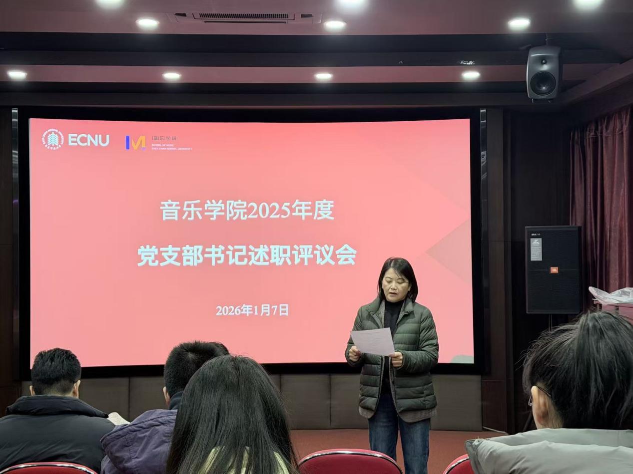 卢蓓蓉在总结时表示,2026年学院党建工作一是持续推进党支部规范化建设,严格落实党员集中教育等基础工作,做好党建带团建工作;二是立足美术专业优势,聚焦重点工作、串点成线,深耕特色党建品牌建设;三是强化队伍建设,充分发挥师生党员先锋模范作用,推动党建工作与学院事业发展深度融合。 新闻链接:https://art.ecnu.edu.cn/4a/fb/c8681a740091/page.htm 音乐学院党委 2026年1月7日下午,华东师范大学音乐学院党委召开2025年度党支部书记述职评议会。学院党委委员、党委专职组织员、特邀党建组织员、全体党支部书记、支部委员及参会,会议由音乐学院党委书记赵旌旌主持。