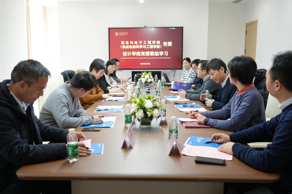 2026年1月14日,华东师范大学信息与电子工程学院(集成电路科学与工程学院)党委与统计学院党委在集成电路产业学院会议室举行联组学习会。会议旨在深入学习贯彻党的二十届四中全会精神,全面落实学校“十五五”规划重点任务,加强两院交流合作,探索学科交叉融合新路径,共同推动学院事业高质量发展。两院党政领导班子成员、青年骨干教师等共同参会。