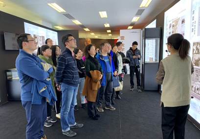 师生党员参观活动的集体合影 党员们在讲解员的带领下,依次参观了“求学立志”“革命历程”“建设伟业”“晚年岁月”“风范永存”“周恩来在上海”“周恩来在江苏”及“周恩来在浙江”等八大主题。展览以500多张图片和大量实物,从事业和情感两条主线,全面展示了周恩来同志的伟大人生。