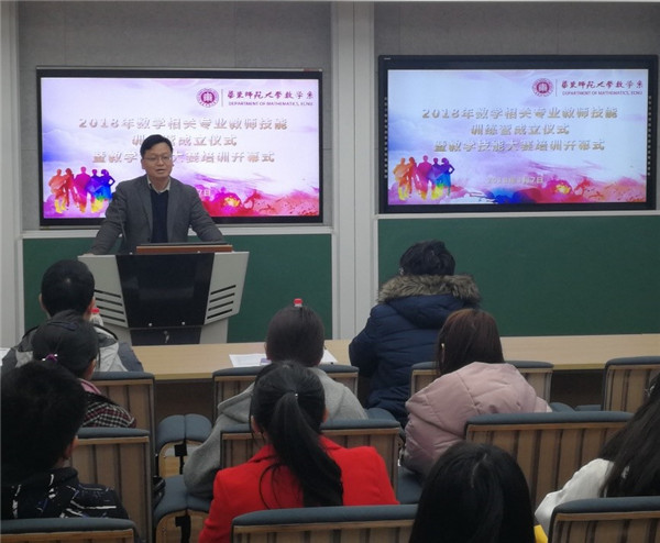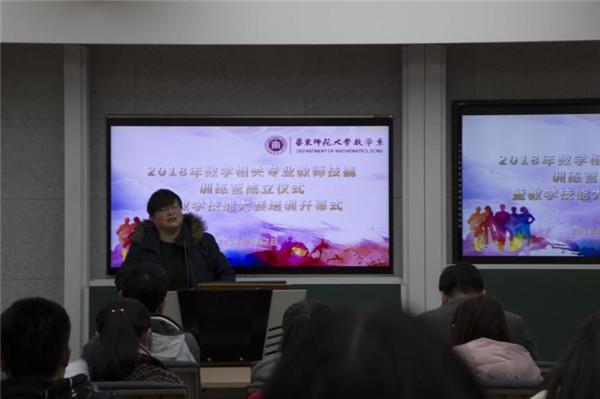 3月7日,在数学系党委的统筹规划下,数学系新学期首次学业指导工作坊活动之2018年数学专业教师技能训练营暨教学技能大赛正式在数学楼102报告厅拉开帷幕。四季教育集团副总经理、复旦中学原校长、中学高级教师、上海市数学名师李驰宇校友来现场为学生们展示示范课。整个会场座无虚席,来自数学、物理、光华书院、孟宪承书院等院系的学生120余人报名参加此次活动。 数学系党委书记贾挚首先致开幕辞,对四季教育集团和李驰宇老师表示感谢,对参加训练营及教学比赛的同学表示欢迎。她说,这是新学期首次学业指导工作坊活动。开展教师技能训练营暨教学技能大赛活动是为了响应国家和学校对师范教育的重视,在整合校友、学校以及各方面资源,充分体现数学专业特色的情况下组织起来的,希望能给学生们带来一对一的教学指导和教学技能的提升。李驰宇在致辞中指出,只有经过教学技能的专门训练,才能真正上好一节课。作为学长,他愿与同学们分享体会。随后,数学系副系主任潘建瑜致辞,表达了对此次活动的赞同与支持,期待看到同学们的精彩表现。开幕式由系党委副书记余富团主持。