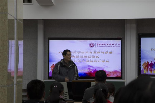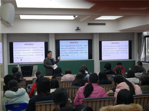 副系主任潘建瑜致辞 简短的开幕式后,李驰宇老师为学生们展示以函数概念为主题的示范课。李驰宇老师深入浅出地为学生们讲解了函数的概念以及表示方式等相关知识,授课速度适中,课件和板书兼顾。整个课程十分流畅。学生们听后纷纷表示受益匪浅,真正了解了“台上十分钟,台下十年功”的含义。